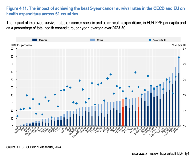 Hans Martens henviser til en anden rapport fra OECD, der udkom i november 2024 (Tackling the Impact of Cancer on Health, the Economy and Society). Rapporten “demonstrerer det stærke økonomiske og samfundsmæssige grundlag for at investere i kræftpolitikker. Mikrosimuleringsmodellering for 51 lande (herunder OECD, EU og G20-landene) viser, at stærkere indsats mod kræft ville give brede fordele. Hvis alle lande klarede sig lige så godt som det bedst præsterende land i kræftbehandling, ville en fjerdedel af for tidlige kræftdødsfald blive forhindret. At tage fat på nøglerisikofaktorer for kræft – herunder tobak, skadeligt alkoholforbrug, usund kost, luftforurening, overvægt og fysisk inaktivitet – ville sænke kræftrater og sundhedsudgifter, samtidig med at arbejdsstyrkens produktivitet øges.”