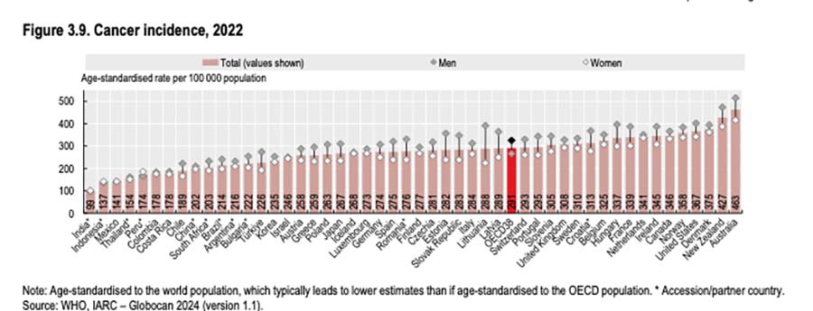 Tallene for cancer hyppigheden (incidens) i OECD’s 38 medlemslande plus nogle ekstra findes i figur 3.9, og de seneste sammenlignelige tal er fra 2022. Danmark ligger højest i Europa, og er nummer 3 på globalt plan – hvor Australien og New Zealand er foran, men er højere end for eksempel i USA. (Når der ses bort fra ikke-melanin hudkræft ligger Danmark som nr. 1 med 349.8 tilfælde foran Norge og Australien ifølge Cancer TODAY (2022).)