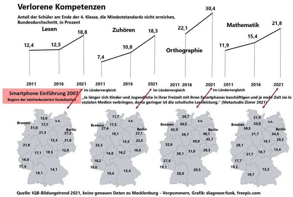 “Ifølge en evaluering af internationale metastudier kan der ikke observeres nogen positiv effekt på elevernes akademiske præstationer ved brugen af digitale medier i skolerne” (Engartner 2024, s. 113). “Digitalisering er ikke løsningen, men problemet,” fastslår han. Metastudier har vist, at digitale medier bidrager til faldet i præstationer. Thomas Thiel, leder af afdelingen “Forskning og undervisning” hos Frankfurter Allgemeine Zeitung (FAZ), skriver, at “digitale medier ikke gavner eleverne, men snarere skader dem” (19. juli 2023). Professor Klaus Zierer, professor i skolepædagogik (Universitetet i Augsburg), konkluderede i 2021, at som et resultat af hans metastudie: “Jo længere børn og unge bruger deres fritid på deres smartphones, og jo mere tid de bruger på sociale medier, desto lavere er deres akademiske præstationer” (Zierer 2021). I 2024 demonstrerede Zierer med et andet metastudie, at overvågede smartphoneforbud i skolerne har øjeblikkelige positive effekter (Böttger 2024).