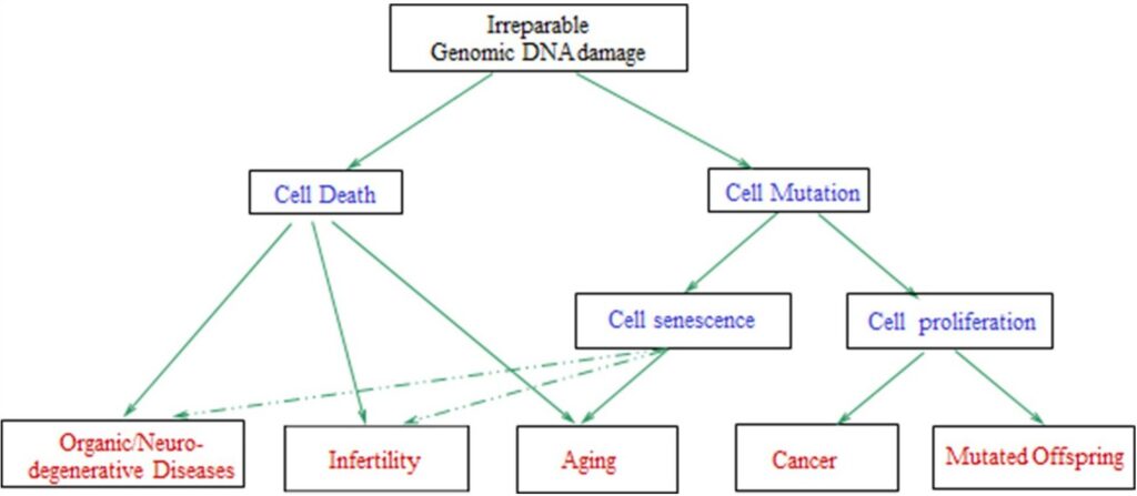 For celler med uopretteligt beskadiget genomisk DNA er mulige udfald cellealdring eller celledød (hvilket kan resultere i aldring, organiske/neurodegenerative sygdomme og/eller reproduktionsvanskeligheder), kræft eller muterede afkom, afhængigt af celletype, de specifikke biologiske/miljømæssige forhold og organismens tilstand (Panagopoulos et al. 2021, Panagopoulos et al. 2022). DNA-skader induceret af OS forklarer således de patologier, der er forbundet med kronisk eksponering for menneskeskabte EMF’er, såsom infertilitet og kræft.