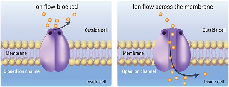 Ionkanaler er specialiserede poreformede proteiner, der findes i cellemembranen. De fungerer som en form for “dørvogtere” for cellen, og muliggør en selektiv transport af ioner (som natrium, kalium, calcium og chlorid) ind og ud af cellen. De elektriske døre åbner og lukker sig afhængigt af, hvor meget negativ eller positiv elektricitet, der er på hhv. indersiden og ydersiden af cellevæggen. Elektricitet skabes af de elektrisk ladede partikler – ioner – som bevæger sig ind og ud af cellevæggens ionkanaler. Når en ion “diffunderer” gennem en ionkanal, skyldes det at ionen trækkes gennem ionkanalen af den elektriske kraft. Ioner påvirkes af en elektrisk ladning, ligesom magneter påvirker hinanden. Er ionen f. eks. positivt ladet og befinder sig på den side af ionkanalen, hvor der er mest positiv elektrisk ladning, vil den blive trukket gennem en åben ionkanal til den anden side, hvor der er mere negativ elektricitet. Elektricitet er den primære drivkraft i nervesignaler.