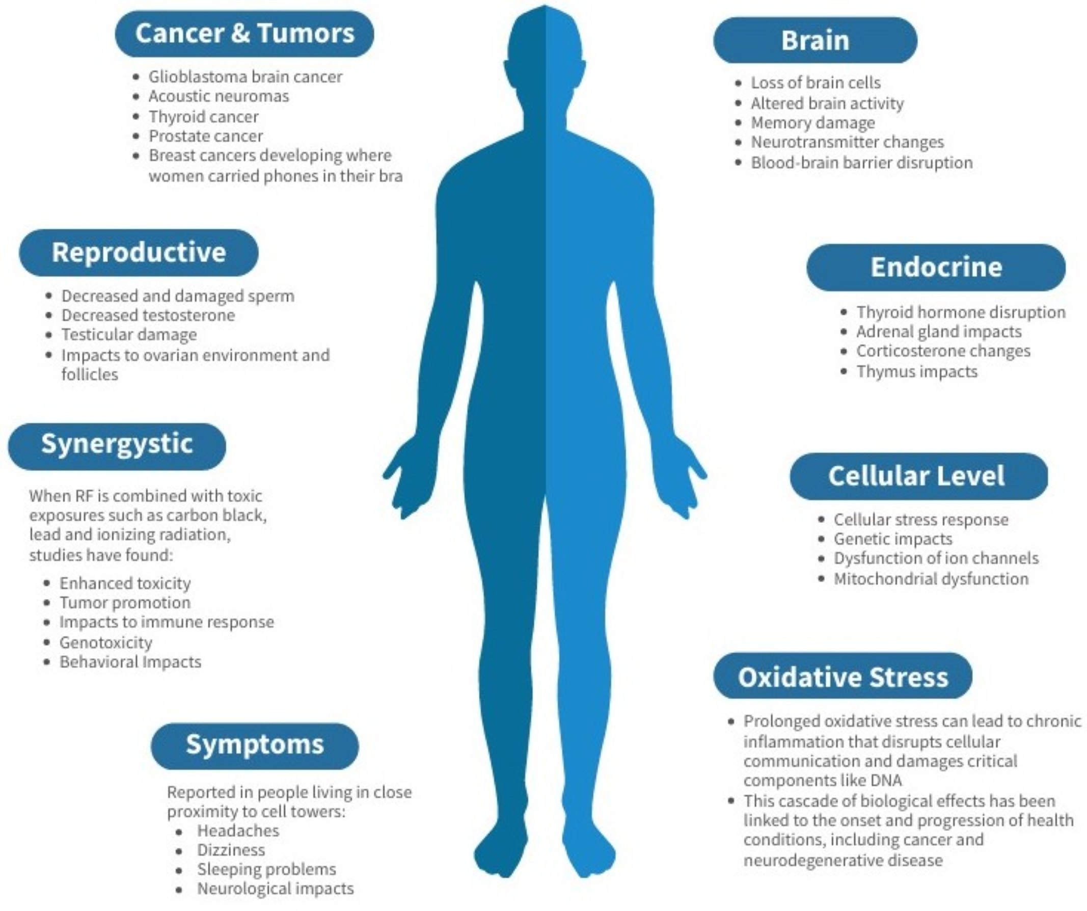 Når radiofrekent stråling (RF) kombineres med giftig eksponering såsom carbon black, bly og ioniserende stråling, har undersøgelser fundet: