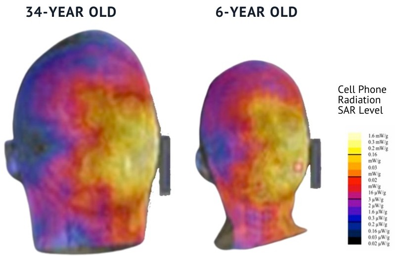 - Hos børn, med et tyndere kranium, højere vandindhold i hjernen samt et mindre hoved, trænger trådløs RF-stråling dybere ind i hjerneområder, der er afgørende for indlæring og hukommelse.