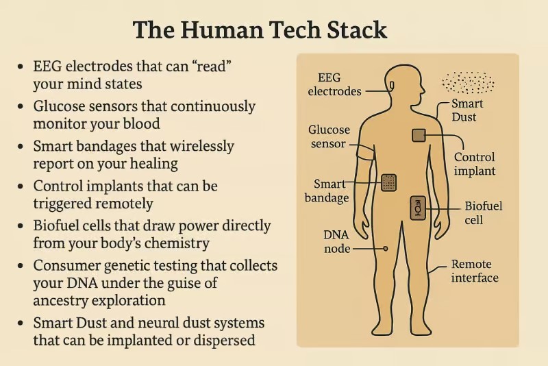 En social mediekonto ved navn AMUSET X tegner et bekymrende billede med sit ‘Bio-Digital Grid’-rammeværk, der beskriver, hvordan teknologier som f.eks. Smart Dust – mikroskopiske sensorer, der interagerer med din krop – og Graphene Neural Interfaces muliggøre en sømløs sammensmeltning af biologi og digitale systemer. Dette gitter, der allerede er i bevægelse igennem DARPAs ElectRx-program og bredere bioovervågningsindsatser, gør din krop til et netværksaktiv, som AMUZED advarer: “Big Tech har allerede bevæget sig IND i din krop – uden din anmodning.”