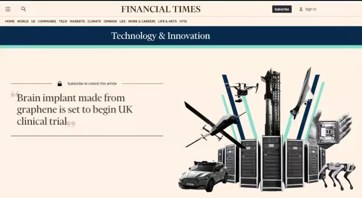 - Financial Times. (2024). “Brain implant made from graphene is set to begin UK clinical trial.” https://www.ft.com/content/4d50e3ac-013d-465a-b835-de67361ba40f