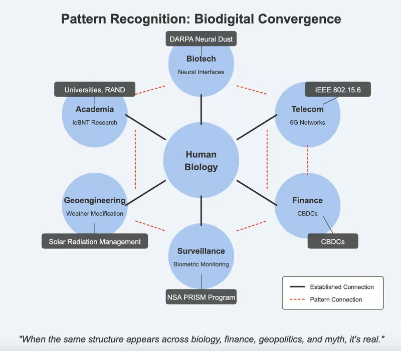 Konventionelle analytiske rammer er især utilstrækkelige til noget så stort. Den transformation, der sker, er så omfattende, spænder over så mange discipliner og forbinder så mange tilsyneladende uafhængige domæner, at den forbliver stort set usynlig, medmindre man specifikt leder efter den. Og hvem har ekspertisen til at vide, hvad man skal kigge efter? De fleste forskere specialiserer sig i snævre felter – neurovidenskab, nanoteknologi, trådløs kommunikation, genteknologi – men næsten ingen er trænet til at se, hvordan disse dele passer sammen. Man ved ikke, hvad man leder efter, før man begynder at genkende mønsteret. Denne metodiske søgen efter sammenhæng på tværs af tilsyneladende uafhængige domæner handler ikke om at bevise en skjult dagsorden – det handler om at afsløre arkitektoniske mønstre, der opstår uanset bygherrernes intentioner.