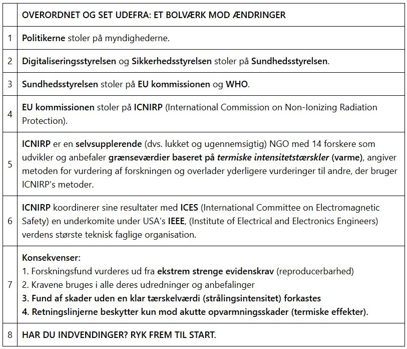 ICNIRP’s anbefalinger stammer grundlæggende fra 1998 og er snart 30 år gamle. De blev opdateret i 2020 for at blive tilpasset det nye 5G netværk, men grænseværdierne er fortsat lige høj, om end ikke højere. Opdateringen og i praksis al den understøttende litteratur er selvrefererende og stammer fra et netværk af medforfattere med kun 17 forskere i centrum, hvoraf de fleste er tilknyttet ICNIRP og/eller IEEE (Institute of Electrical and Electronics Engineers, verdens største teknisk faglige organisation), nogle er selv forfattere til ‘ICNIRP 2020’. Forfatterne bag er derfor på ingen måde repræsentative for hovedparten af forskerne inden for EMF og sundhed.