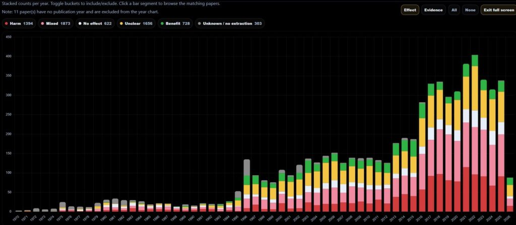 Grafen herunder er ikke opdelt efter finansieringskilde, men viser det generelt sigende antal forskningsartikler, der viser effekter i en eller anden grad.