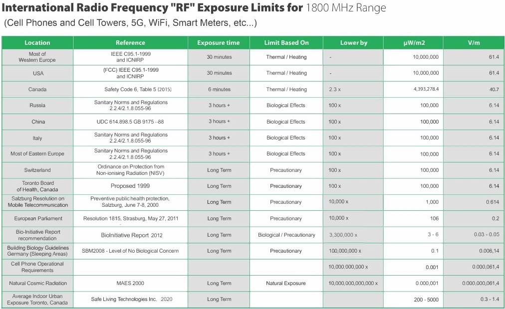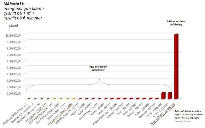 Danmark har en af verdens højeste grænseværdier for stråling fra trådløs teknologi med en maksimal grænseværdi på 10.000.000 μW/m2 (mikrowatt pr. m2), hvilket er i overensstemmelse med anbefalingerne i ICNIRP 2020. Det gælder ligeledes for de øvrige nordiske lande sammen med de fleste vestlige NATO-lande incl. USA. Andre lande har lavere grænseværdier. Indien og Israel har f.eks. 1/10 af vores grænseværdi, mens lande som Rusland og Kina har 1/100. Flere europæiske lande har endnu lavere grænseværdier. Tankevækkende er det, at Danmark ligeledes har det højeste antal kræfttilfælde i Europa.