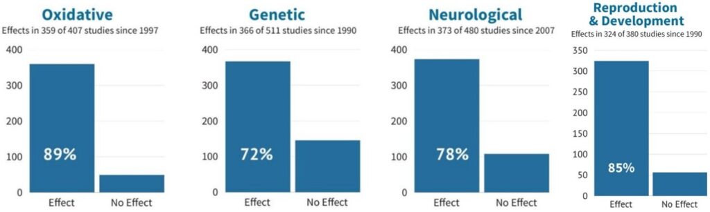 Dr. Henry Lai, professor emeritus ved University of Washington, æresredaktør for tidsskriftet Electromagnetic Biology and Medicine og emeritusmedlem af ICBE-EMF, har samlet mere end 2.500 forsknings resuméer om de biologiske effekter af EMF-eksponering og fundet, at flertallet af de studier, der undersøgte inducering af oxidative effekter (som fører til oxidativt stress, der beskadiger celler, proteiner og DNA) samt neurologiske og reproduktive resultater, har rapporteret signifikante effekter. Blandt hundredvis af studier af radiofrekvent stråling (RFR) rapporterede 71% til 89% signifikante effekter. Blandt hundredvis af studier af ekstremt lavfrekvent stråling (ELF) og statiske felter rapporterede 78% til 91% signifikante effekter (dec. 2025).