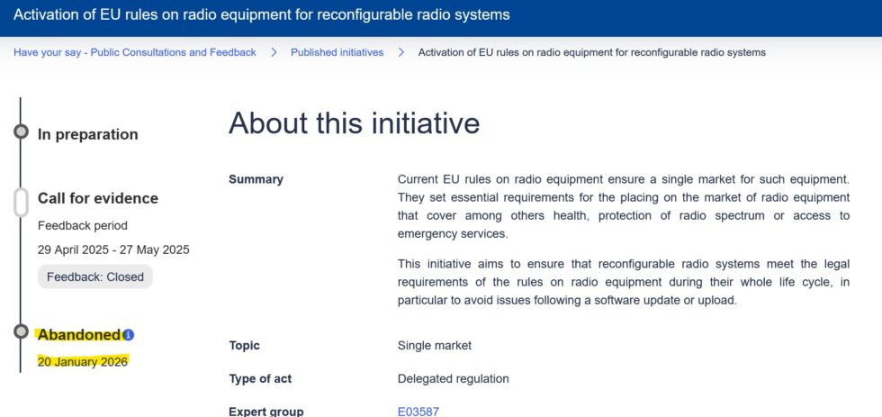 - Europæisk initiativ: “Aktivering af EU-regler for radioudstyr” (Status: Opgivet)