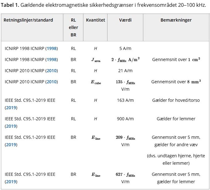 Men da H-feltet ikke fuldt ud kan begrænses til kogegrejet, har tilsynsmyndighederne udtrykt bekymring om induktionskogepladerne overholder grænseværdierne for menneskelig eksponering. De elektromagnetiske (EM) eksponeringsgrænser er blevet defineret af forskellige organisationer, for eksempel International Commission on Nonionizing Radiation Protection (ICNIRP) (ICNIRP 1998, 2010) og Institute of Electrical and Electronics Engineers (IEEE) (IEEE 2019). I øjeblikket har de fleste lande, herunder EU-landene (Det Europæiske Råd 1999) og Schweiz, vedtaget de tidligere ICNIRP-retningslinjer fra 1998. De seneste ICNIRP 2010-retningslinjer (ICNIRP 2010) giver lempelser af grænseværdierne for nogle frekvensområder, der endnu ikke er blevet vedtaget ved lov. Retningslinjerne/standarderne definerer grænserne for referenceniveauer (RL) for hændelsesfelter og grundlæggende begrænsningsgrænser (BR) for inducerede felter (f.eks. inducerede elektriske (E-) felter, inducerede strømtætheder J). Vurderingen af om eksponeringen overholdes af RL er lettere, men meget mere konservativ end vurderingen baseret på BR-grænser, da RL er blevet bestemt for ensartede felteksponeringer. Induktionskogepladernes felter er dog ikke ensartede, højest tæt på varmespiralen og henfalder hurtigt med afstanden. De gældende grænser for induktionskogeplader er opsummeret i tabel 1. I sine retningslinjer fra 2010 ændrede ICNIRP BR-metrikken fra induceret strømtæthed (ICNIRP 1998) til induceret E-felt (ICNIRP 2010) for at tage højde for nervestimulering ikke kun i centralnervesystemet, men også i det perifere nervesystem. Det skal bemærkes, at omstrejfende kvasistatiske indfaldende E-felter kan være relativt store og overskride de relevante RL-grænser. Den gennemførte strømvurdering er imidlertid en tilstrækkelig robust metode til at påvise overholdelse af kontaktstrømsgrænserne.