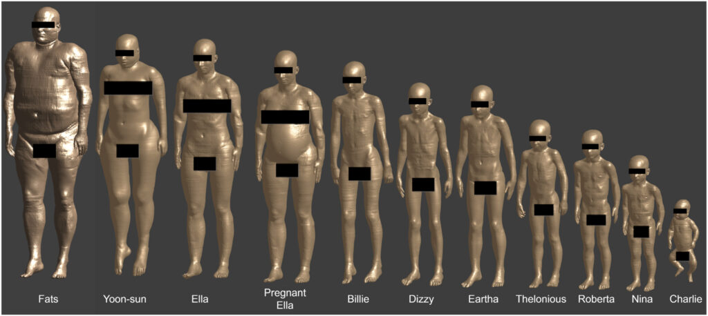 Eksponeringsscenariet, hvor brugeren/tilskueren er placeret foran kogepladen, blev undersøgt med 10 ViP-modeller i forskellige aldre, herunder de tre versioner af den gravide Ella-model med 3 måneder gamle, 7 måneder gamle og 9 måneder gamle fostre. I simuleringen af dette scenarie blev de målte 3D H-felter i zone 1 brugt som kilde. Hver ViP-model blev placeret i det volumen, der svarer til zone 1. Langs -aksen var hver model centreret i volumen. Langs -aksen blev afstanden mellem hver model og forkanten af hver kogeplade justeret i henhold til minimumskravene til afstand fra kogepladernes monteringsvejledning. Langs -aksen blev hver voksenmodel placeret, så den stod på et virtuelt jordplan placeret 85 cm under kogepladens overflade. Børne-ViP-modellerne blev løftet for at bringe deres hoveder op i højden af kogepladens overflade. Simuleringsmodellerne for Nina og gravide Ella (9 måneder) er vist i henholdsvis figur 10 og 11. ViP-modellerne, der blev brugt i de dosimetriske simuleringer med de målte H-felter som kilde, blev afkortet ved grænsen til scanningsvolumenerne. Zone 1 dækker H-felter med et felthenfald (i forhold til det maksimale H-felt i zonen) på 20 dB og omfatter alle væv omkring de spidsinducerede felter. Fejlen på grund af afkortningen af ViP-modellerne er blevet bestemt til at være mindre end 0,2 dB. Et aktivt madlavningsscenarie, hvor brugeren rører i en gryde, blev undersøgt med følgende tre specielle tilfælde:
