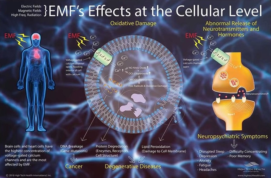 Forskellige tumorer, DNA-skader, reproduktionsskader, hukommelsespåvirkning, autisme, hovedpine, desorientering, søvnløshed, udtynding af blod-hjerne-barriere, svimmelhed, træthed, tinnitus, hjertestop, kognitiv tilbagegang, sædskader, oxidativt stress, øjenskader, forskellige kræftformer, hjerneskade, høreskader, depression, angst, fødselsdefekter, hjertesygdomme, adfærdsproblemer, koncentrationsproblemer, rysten, appetitløshed, MS, ALS, immunsuppression. Og sidst men ikke mindst, fremskyndet aldring.