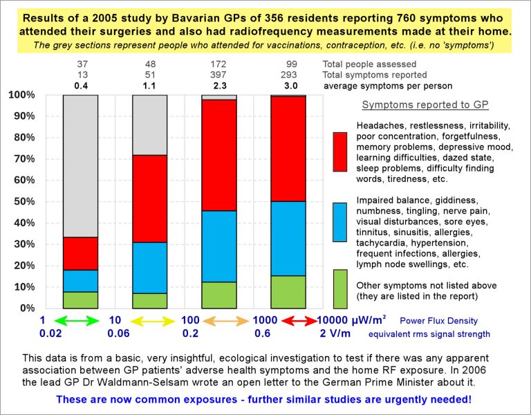 I 2005 skrev Dr. Cornelia Waldmann-Selsam et åbent brev til Bayerlands statsminister Edmund Stoiber efter at have vurderet 356 beboere, cer var udsat for RF-stråling. Symptomerne omfattede: