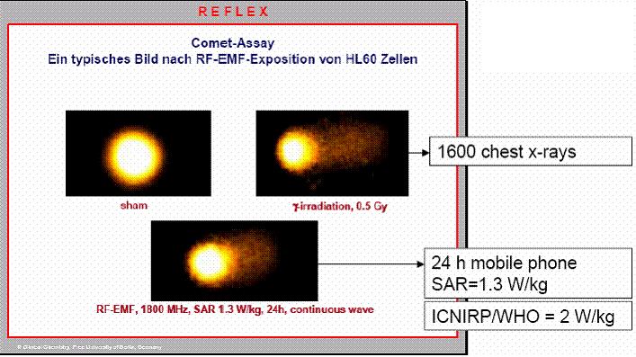 - Disse in vitro-resultater giver en mekanistisk forklaring på de epidemiologiske mønstre, der er observeret i Wishaw, Naila, Berlin og Israel, og fremhæver potentialet for langsigtede sundhedseffekter fra bolig-RF-eksponering. DNA bryder sammen, som følgende slide viser: