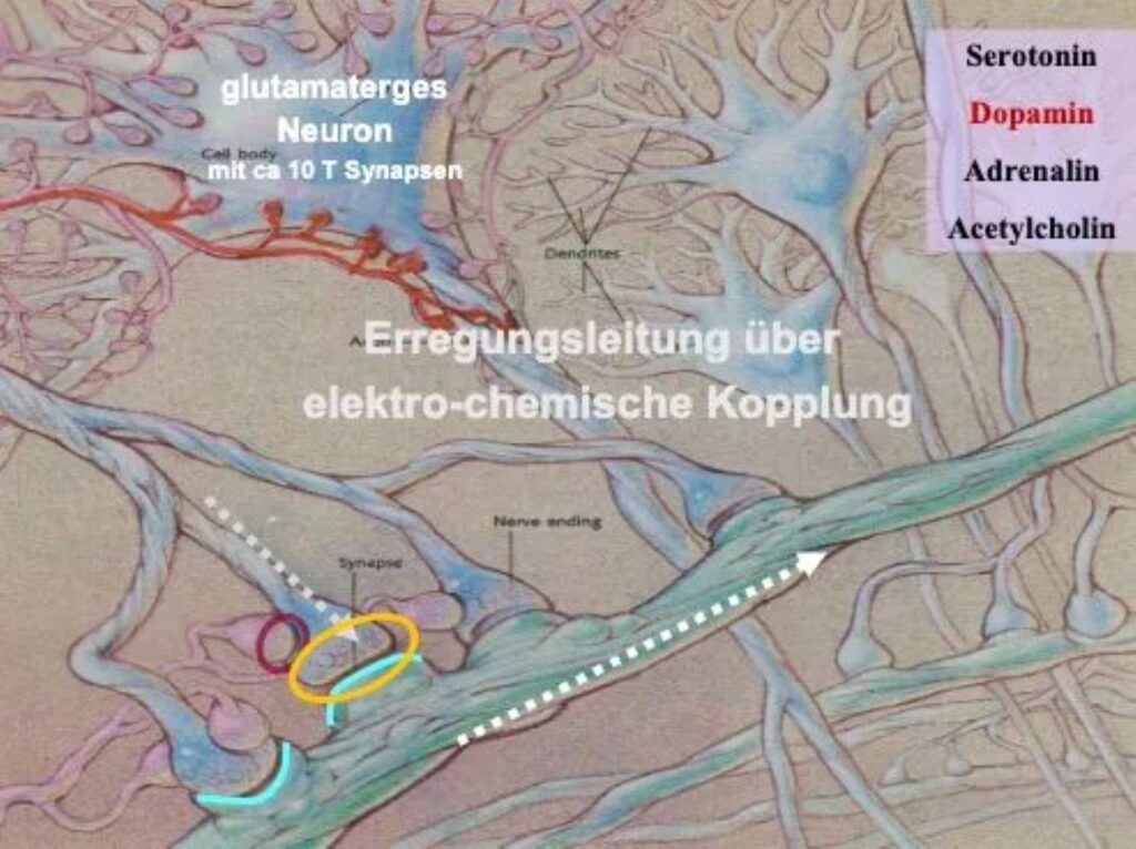 Det kommer tydeligt til udtryk i tilfældet med dopamin. Studier af afhængighed af mobiltelefonen, som blandt andet udløses af overstimulering, viser, at forsinket modning af frontallappen skyldes mangel på dopamin, fordi belønningssystemet indtager en uforholdsmæssig stor mængde dopamin og trækker det ud af frontallappen. Det tidligere nævnte sneboldkrigsstudie (se ovenfor) dokumenterer, at underudviklingen af rum-tid-hukommelsen er forbundet med en for lav forsyning af dopamin til hjernen. Hu et al. rapporterer om studier, der viser, at bestråling “også har ført til en betydelig reduktion af dopamin i hippocampus” (s. 2), hvilket også kan føre til “nedsat indlærings- og hukommelsesevne“. WLAN-studier viser, at effekten af EMF på neurotransmittere fører til en “svækkelse af den rumlige arbejdshukommelsesfunktion” (s. 8). Det blev allerede demonstreret af Henry Lai, en pioner inden for EMF-forskning, i 1992, dvs. de samme konsekvenser, som også blev fundet i sneboldkrigsstudiet og det schweiziske studie af figurativ hukommelse.