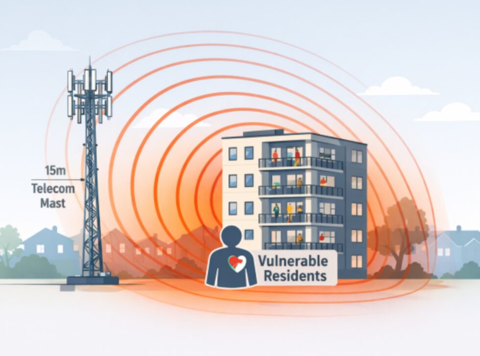 Den foreslåede mobilmast på Lansdown Road stod cirka 17 meter fra Harris Court, en fem-etagers lejlighedsbygning, med de øverste etager på linje med antennehovedet, hvilket placerede beboerne i en meget sandsynlig ICNIRP-offentlig eksklusionszone.